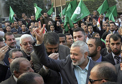ومن ناحيته وصف إسماعيل هنية، رئيس الوزراء الفلسطينى، حركة حماس أنها حركة جهادية للإخوان المسلمين فلسطينية الوجه، وقال من يرى المشهد الآن فى مقر الإخوان المسلمين سيدرك أنه أثار الارتباك والفزع فى قلب إسرائيل، مضيفا ان وجودنا مع الإخوان يهدد الكيان الإسرائيلى، مشيرا إلى أن إسرائيل الآن تسعى للحفاظ على وجودها أكثر من توسعها، واتهم هنية نظام حسنى مبارك بأنه كان جزءا من ثلاثة محاور لفرض الحصار على غزة، وهو محور اقتصادى ومحور عسكرى، بالإضافة لمحور مبارك وأعوانه، واعتبر هنية أن استقلال حماس بغزة كان بمثابة البداية لثورات الربيع العربى، لافتا إلى أنه جاء اليوم لإخوانه فى مصر لينقل لهم الوضع فى غزة ويطلب مساندتهم.