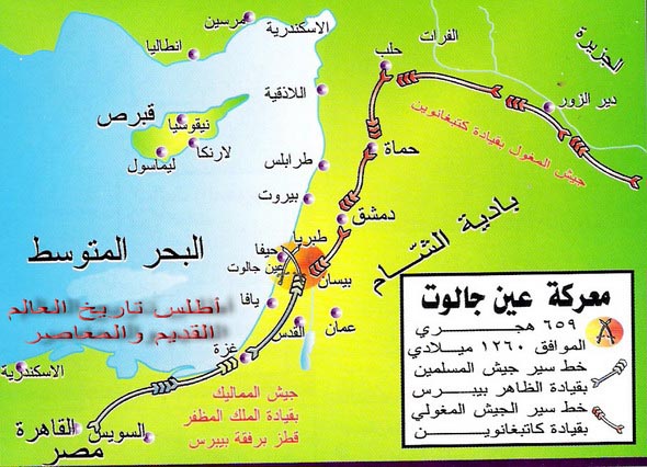 ثم وافى قطز الأمير بيبرس عند عين جالوت بين بيسان ونابلس.